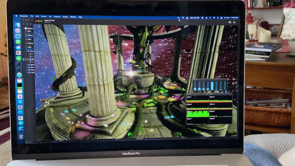That’s Apple’s deferred lighting Metal sample running on my M1 viewed in a shared desktop session. It’s a bit shaky because it’s rendering over a WiFi network. The rendition is solid when viewed on an attached monitor.
