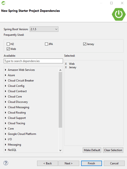 - Next, we’ll choose “Web” and “Jersey”. This keeps what we want to do really simple. There are no database needs at this point or any other shenanigans.