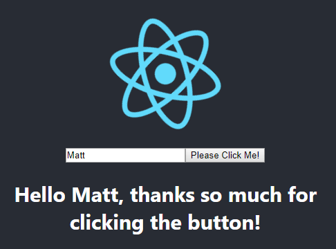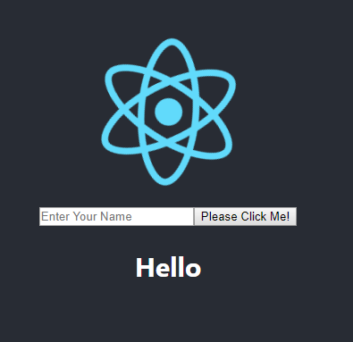 import React, { Component } from 'react'; import logo from './logo.svg'; import './App.css'; class App extends Component { state = { isLoading: false, greeting: "" }; sayHello = async (event) => { event.preventDefault(); let response = await fetch('/greeting?name=' + this.state.greeting); let body = await response.json(); this.setState({ greeting: body.name, isLoading: false, isGreetingVisible: '' }); } updateName = (event) => { event.preventDefault(); this.setState({greeting: event.target.value, isLoading: false}); } render() { const {greeting, isLoading} = this.state; if (isLoading) { return Loading... ; } return ( <div className="App"> <header className="App-header"> <img src={logo} className="App-logo" alt="logo" /> <div className="App-intro"> <input onChange={(event)=>this.updateName(event)} placeholder="Enter Your Name"></input> <button onClick={(event)=>this.sayHello(event)}>Please Click Me!</button> <h2 style={{visibility: this.isGreetingVisible}}>Hello {this.state.greeting}</h2> </div> </header> </div> ); } } export default App;`